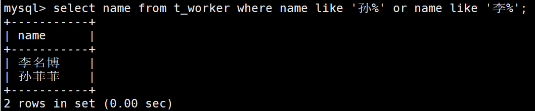 mysql> select name from t_worker where name like '孙%' or name like '李%';