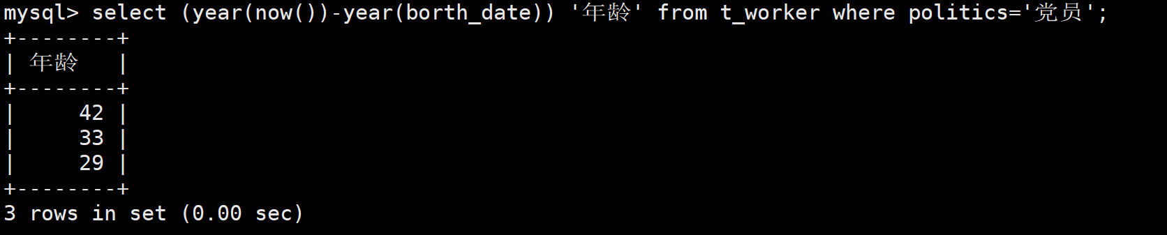 mysql> select (year(now())-year(borth_date)) '年龄' from t_worker where politics='党员';