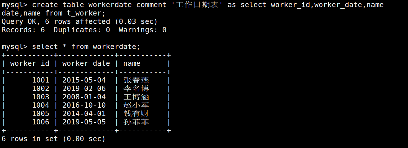 mysql> create table workerdate comment '工作日期表' as select worker_id,worker_ddate,name from t_worker;