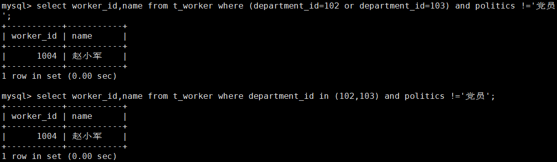 mysql> select worker_id,name from t_worker where (department_id=102 or department_id=103) and politics !='党员';