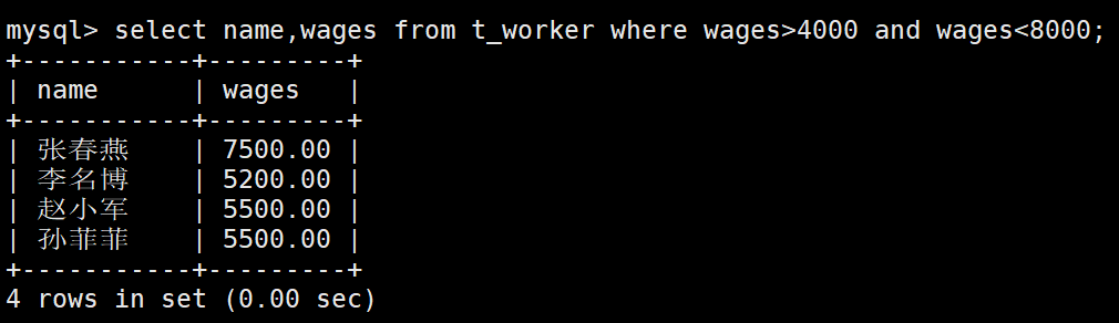 mysql> select name,wages from t_worker where wages>4000 and wages<8000;