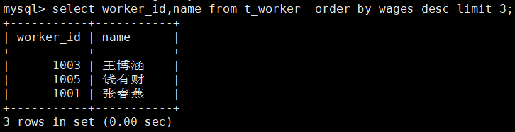 mysql> select worker_id,name from t_worker order by wages desc limit 3;