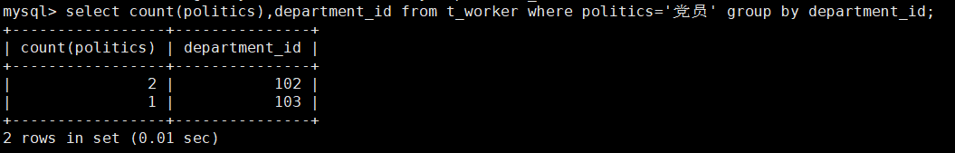 mysql> select count(politics),department_id from t_worker where politics='党员' group by department_id;