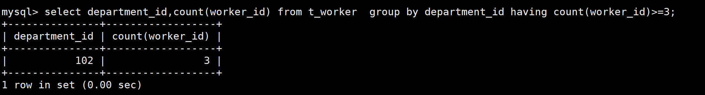 mysql> select department_id,count(worker_id) from t_worker group by department_id having count(worker_id)>=3;