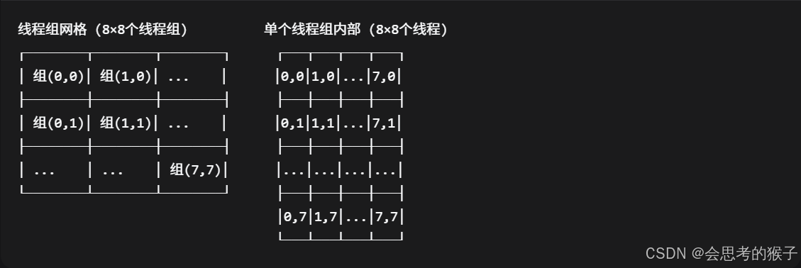 全局线程分布 (64×64): 每个小格子代表一个线程组(8×8线程),整个大网格有8×8=64个线程组┌─────────────────────────────────────────────────────────────┐ │ 线程组(0,0) 线程组(1,0) ... 线程组(7,0) │ │ ┌───────┐ ┌───────┐ ┌───────┐ │ │ │8×8线程│ │8×8线程│ ... │8×8线程│ │ │ └───────┘ └───────┘ └───────┘ │ ├─────────────────────────────────────────────────────────────┤ │ 线程组(0,1) 线程组(1,1) ... 线程组(7,1) │ │ ┌───────┐ ┌───────┐ ┌───────┐ │ │ │8×8线程│ │8×8线程│ ... │8×8线程│ │ │ └───────┘ └───────┘ └───────┘ │ ├─────────────────────────────────────────────────────────────┤ │ ... ... ... ... │ ├─────────────────────────────────────────────────────────────┤ │ 线程组(0,7) 线程组(1,7) ... 线程组(7,7) │ │ ┌───────┐ ┌───────┐ ┌───────┐ │ │ │8×8线程│ │8×8线程│ ... │8×8线程│ │ │ └───────┘ └───────┘ └───────┘ │ └─────────────────────────────────────────────────────────────┘