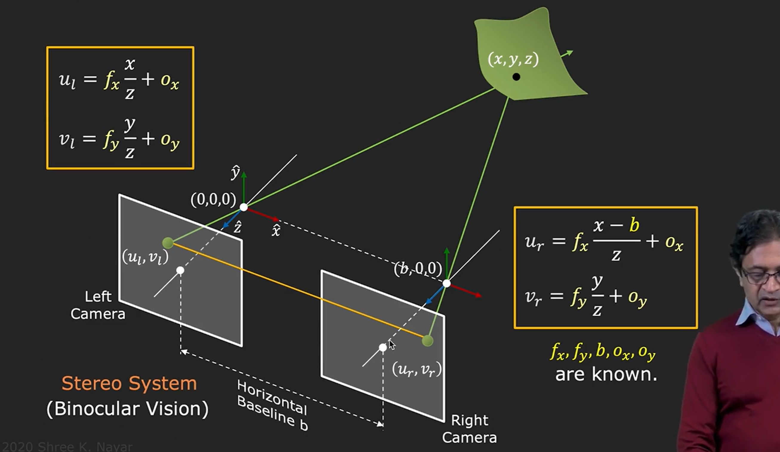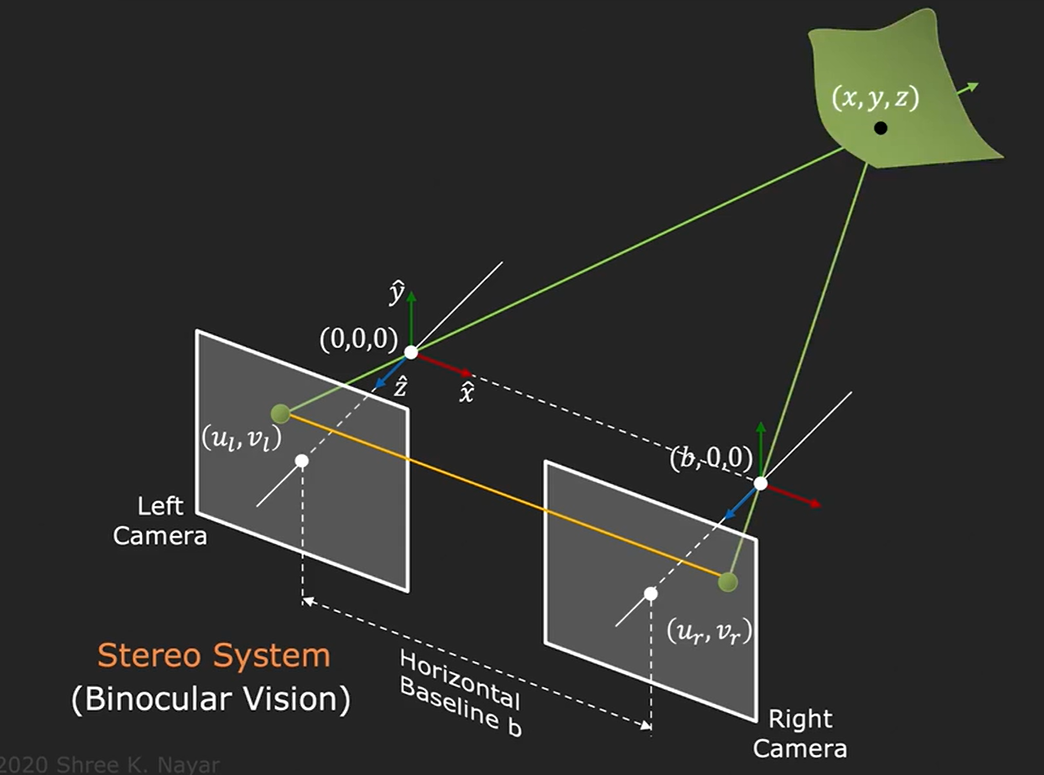 因此为了重建3D,需要给出更多信息,最简单的一个方式就是使用两台相机拍摄两张图像。,同一个点经过光轴交汇点就是场景所在地。