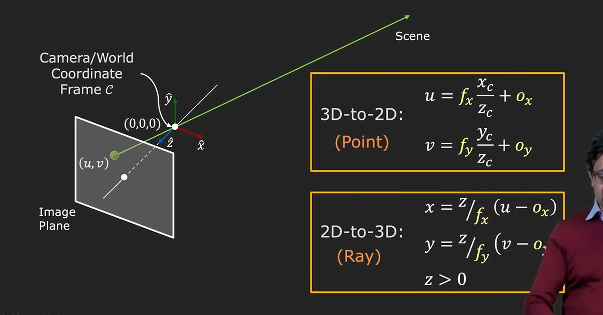 在标定过程中,给定3D中的一个点,根据内外参数可以计算出其在图像中坐标,但是从2D到3D缺一个射线方程。