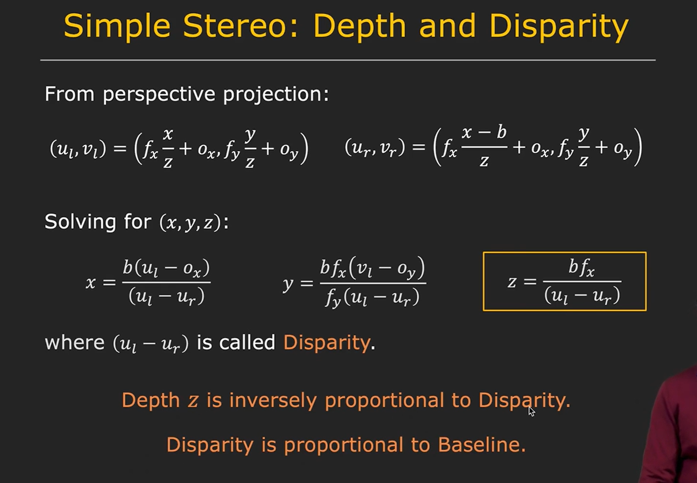 可以看出视差和深度成反比,当你把一根手指放在离眼睛比较近的地方,你先后睁开左右眼,可以明显感觉到手指跳动了一下,但是把手指放在远处,感觉就不会那么强烈,离得越近,视差越大。