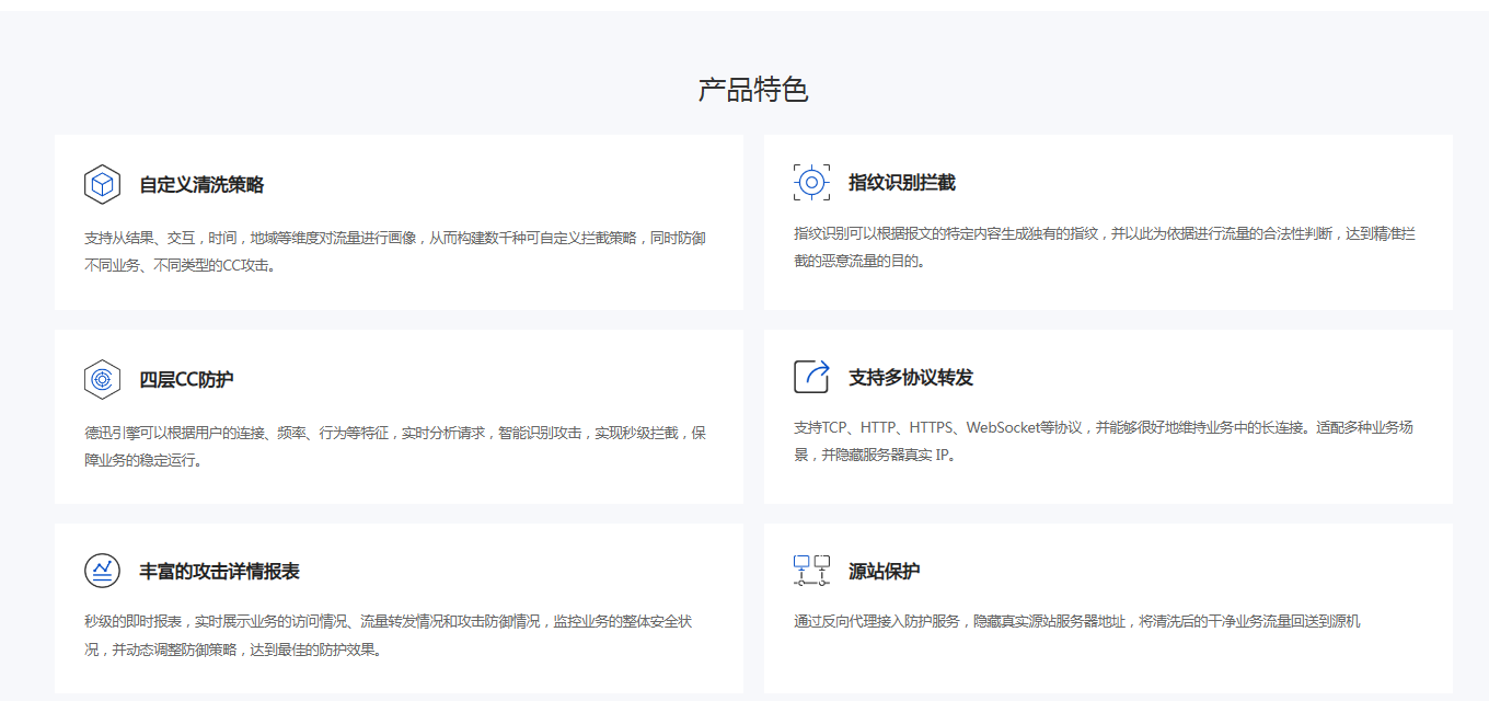 精准防御CC攻击,通过创新的报文基因技术,在用户与防护节点之间建立加密的IP隧道,准确识别合法 报文,阻止非法流量进入,可彻底防御CC攻击等资源消耗型攻击,并且包含以下独有防护功能: