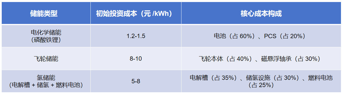 - 日内调峰场景(4 小时循环充放电):电化学储能 LCOE 约 0.4 元 /kWh,飞轮储能约 1.2 元 /kWh(时长不足需频繁充放电,效率下降),氢储能约 1.5 元 /kWh(转化效率低);