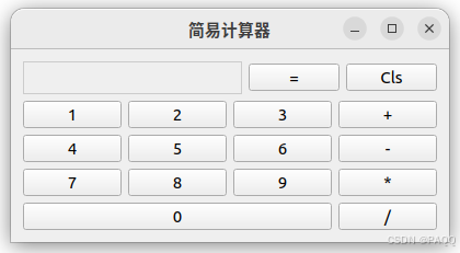 {//结果字符串result_string = "";//正则匹配表达式expression_pattern = std::regex(R"(^([-]?\d+)([/*+-])([-]?\d+)$)"); //匹配表达式 加入括号分组clear_pattern = std::regex(R"(^([-]?\d+)([/*+-])?([-]?\d+)?$)"); //判断表达式 //窗口属性setWindowTitle("简易计算器");resize(400, 100);//交互框美化result_label.setMinimumWidth(200);result_label.setAlignment(Qt::AlignRight);result_label.setStyleSheet("border: 1px solid #ccc; padding: 5px; font-size: 16px;");//按钮链接connect(&button_0,&QPushButton::clicked,[&](){put_text(button_0);});connect(&button_1,&QPushButton::clicked,[&](){put_text(button_1);});connect(&button_2,&QPushButton::clicked,[&](){put_text(button_2);});connect(&button_3,&QPushButton::clicked,[&](){put_text(button_3);});connect(&button_4,&QPushButton::clicked,[&](){put_text(button_4);});connect(&button_5,&QPushButton::clicked,[&](){put_text(button_5);});connect(&button_6,&QPushButton::clicked,[&](){put_text(button_6);});connect(&button_7,&QPushButton::clicked,[&](){put_text(button_7);});connect(&button_8,&QPushButton::clicked,[&](){put_text(button_8);});connect(&button_9,&QPushButton::clicked,[&](){put_text(button_9);});connect(&add_button,&QPushButton::clicked,[&](){put_text(add_button);});connect(&sub_button,&QPushButton::clicked,[&](){put_text(sub_button);});connect(&mul_button,&QPushButton::clicked,[&](){put_text(mul_button);});connect(&div_button,&QPushButton::clicked,[&](){put_text(div_button);});connect(&equal_button,&QPushButton::clicked,[&](){calculateExpression();});connect(&delete_button,&QPushButton::clicked,[&](){result_label.setText("");});//布局配置 先配置九宫格按钮布局glayout.addWidget(&button_1, 0, 0);glayout.addWidget(&button_1, 0, 0);glayout.addWidget(&button_2, 0, 1);glayout.addWidget(&button_3, 0, 2);glayout.addWidget(&button_4, 1, 0);glayout.addWidget(&button_5, 1, 1);glayout.addWidget(&button_6, 1, 2);glayout.addWidget(&button_7, 2, 0);glayout.addWidget(&button_8, 2, 1);glayout.addWidget(&button_9, 2, 2);//按照小键盘布局,0跨多列,因为没有 . 所以跨三列glayout.addWidget(&button_0, 3, 0, 1, 3);//第四列填充符号按钮glayout.addWidget(&add_button, 0, 3);glayout.addWidget(&sub_button, 1, 3);glayout.addWidget(&mul_button, 2, 3);glayout.addWidget(&div_button, 3, 3);//配置水平布局,将结果框和‘=’按钮‘cls’按钮放置同一个布局中hlayout.addWidget(&result_label);hlayout.addWidget(&equal_button);hlayout.addWidget(&delete_button);//配置垂直布局,将水平布局和网格布局放置同一个垂直布局中vlayout.addLayout(&hlayout); //先水平vlayout.addLayout(&glayout); //后网格setLayout(&vlayout); //让整个类(窗口)的布局使用垂直布局}void Calculator::put_text(QPushButton & button)