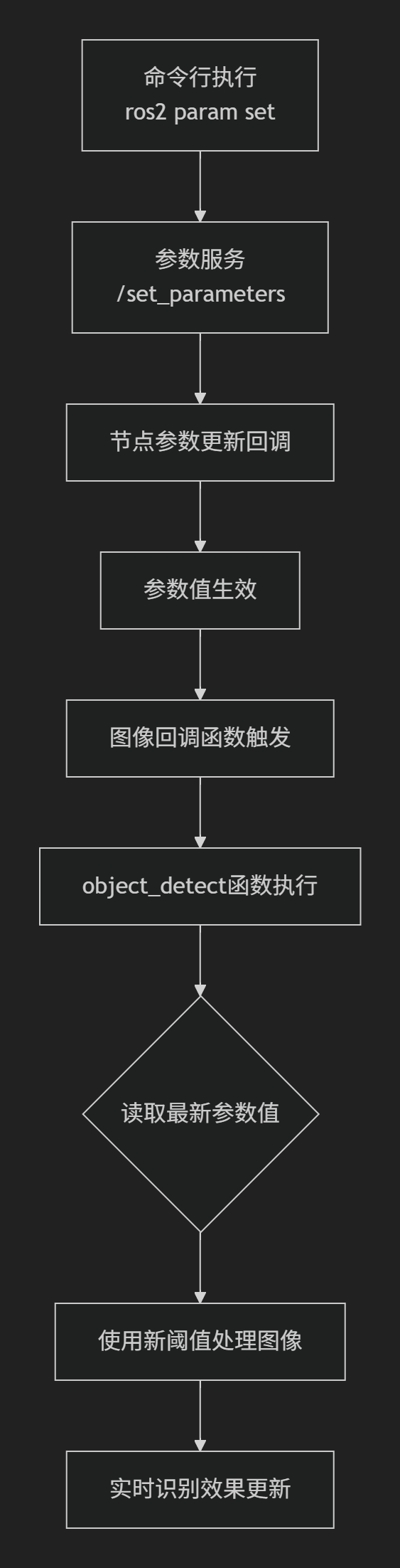 发起一个服务调用,请求是设置指定参数的新值。参数更新:节点内部有一个参数服务端(由ROS2底层自动创建),它接收这个请求,并更新内存中