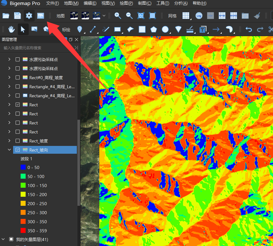 点开工具箱 里面的 坡向分析