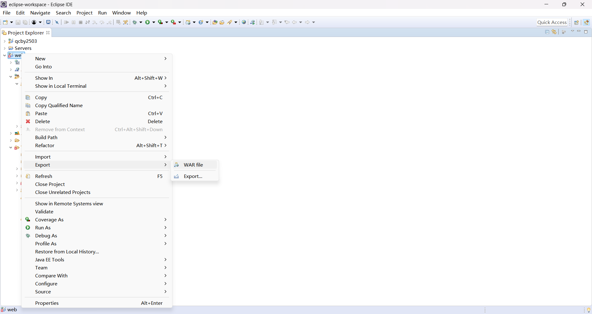 在 Eclipse 的「Project Explorer」中,右键选中需要部署的 JavaWeb 项目,选择「Export」(导出)选项;