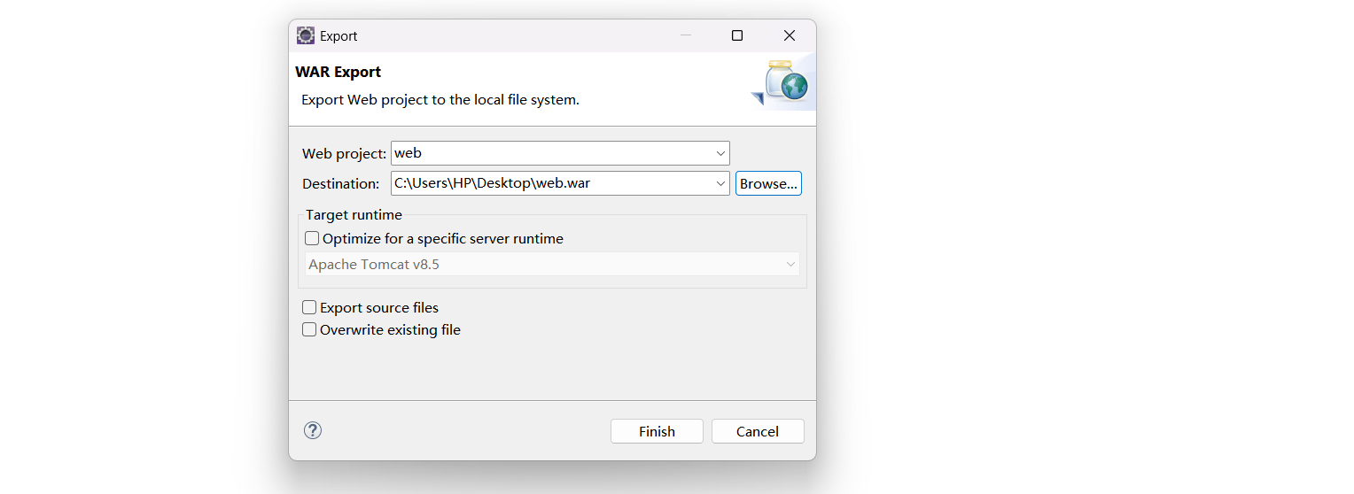在「WAR Export」界面,确认「Web project」为目标项目,点击「Browse」选择 WAR 文件的保存路径;