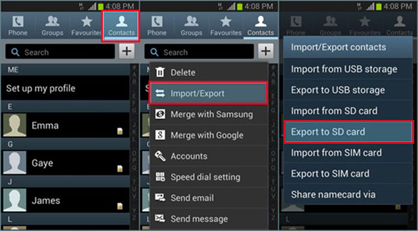 - 在 Android 上激活“联系人”应用,然后选择“更多”>“设置”>“导入/导出”>“导出到 SD 卡”。