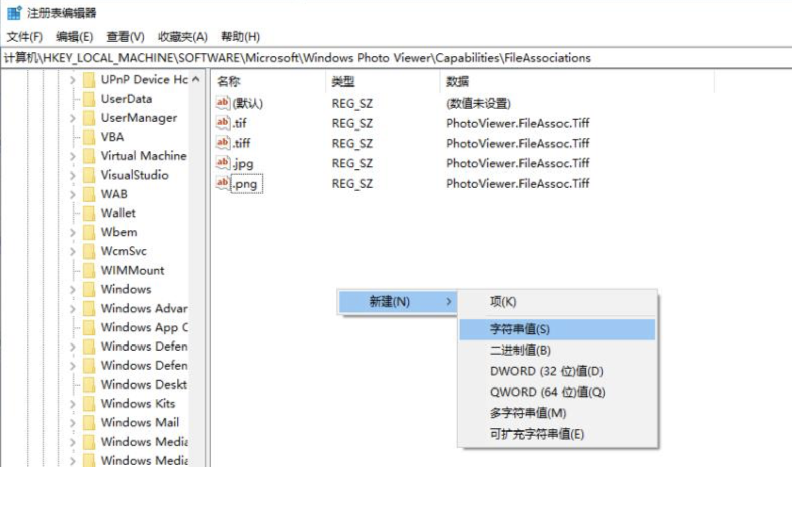 ; 路径:HKEY_LOCAL_MACHINE\SOFTWARE\Microsoft\Windows Photo Viewer\Capabilities\FileAssociations
