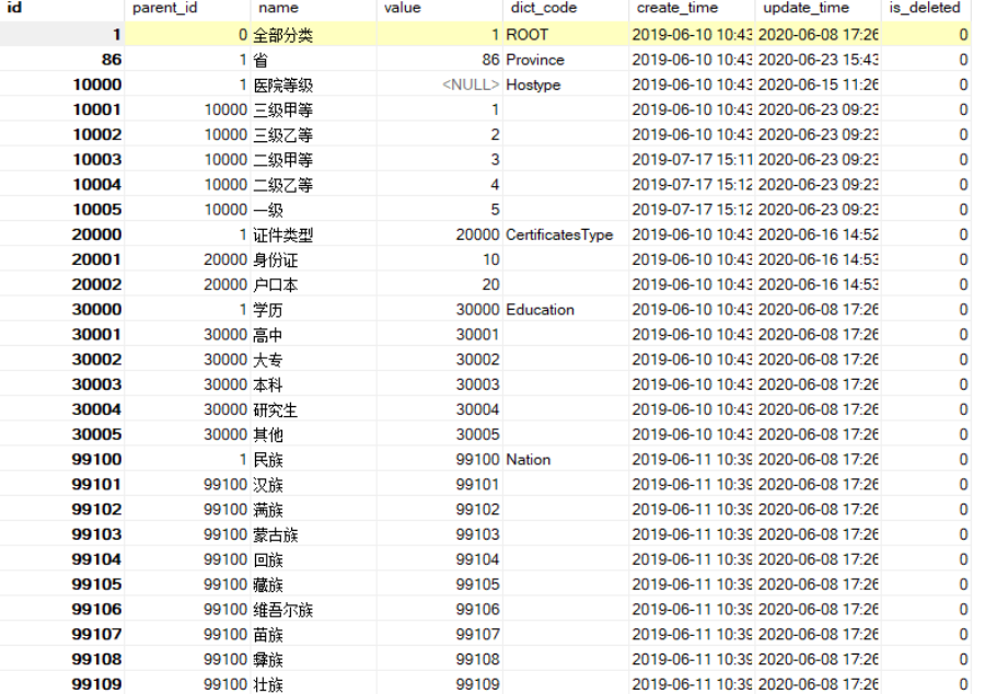 上级id,通过id与parent_id构建上下级关系,例如:我们要获取所有行业数据,那么只需要查询parent_id=20000的数据