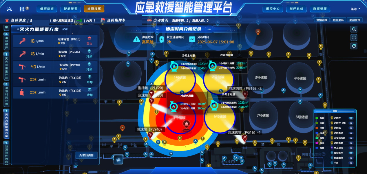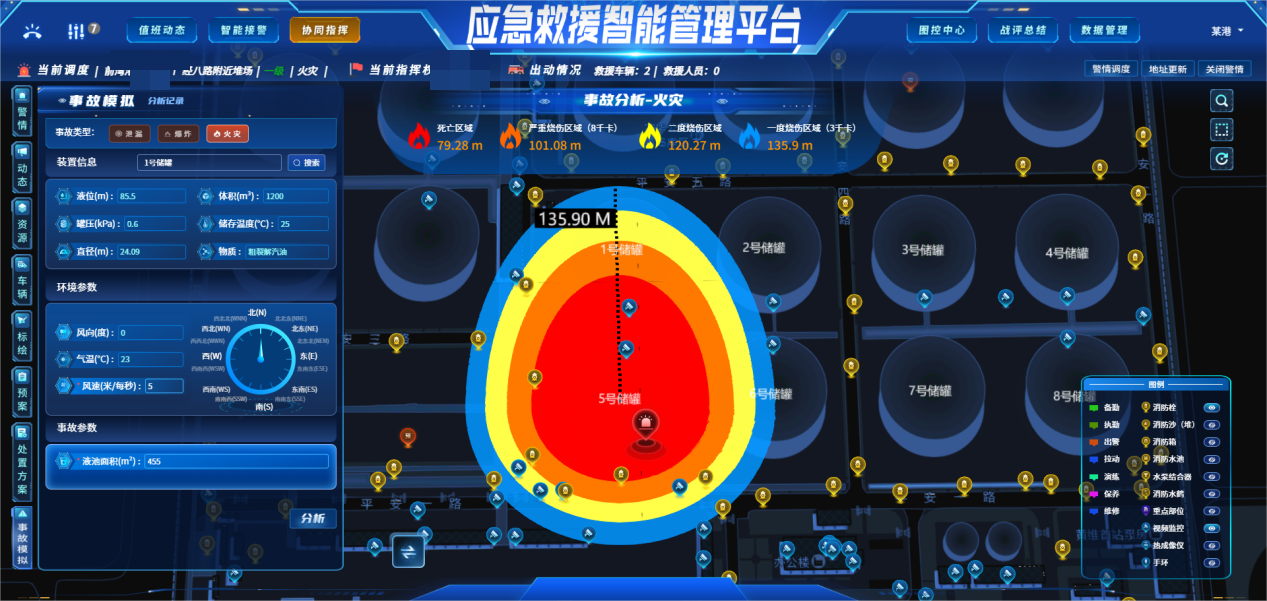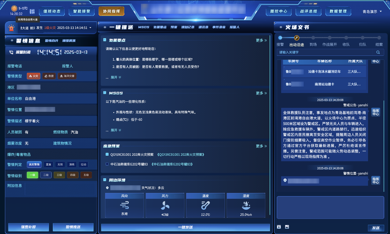 针对化工园区多储罐、多仓库的复杂场景,前景互联应急救援指挥平台可基于大疆无人机采集的数据生成实时三维模型,并整合气象信息、周边救援资源等数据,形成“应急救援辅助决策一张图”。指挥人员通过这张图,能够直观掌握储罐布局、危险物质存储点位等核心要素,进而快速确定救援力量如何部署、应急车辆停靠区域以及灭火炮射程。让决策从被动梳理转向主动可视化,大幅度压缩决策时间,提升处置效率。