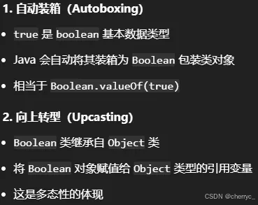 boolean primitive = true; // 基本类型 Boolean wrapper = Boolean.valueOf(primitive); // 装箱 Object obj1 = wrapper; // 向上转型