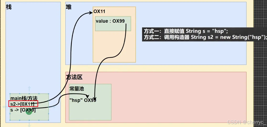 存储在字符串常量池:Java 使用字符串常量池来优化字符串存储,相同的字符串字面量会指向池中的同一个对象。字符串的本质是char数组,对象中的属性char value[]用于存放字符串数组。