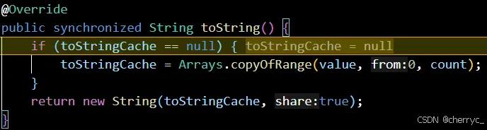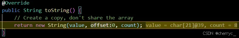 :将字符串转换为一个新的字符数组,包含字符串中的所有字符;对返回数组的修改不会影响原字符串【需要修改字符串内容时(先转为char数组,修改后再转为String)】 -