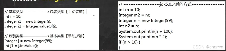 Integer i = 10; // 底层使用 Integer.valueOf(10),返回new Integer(10);// 自动拆箱:包装类 -> 基本类型