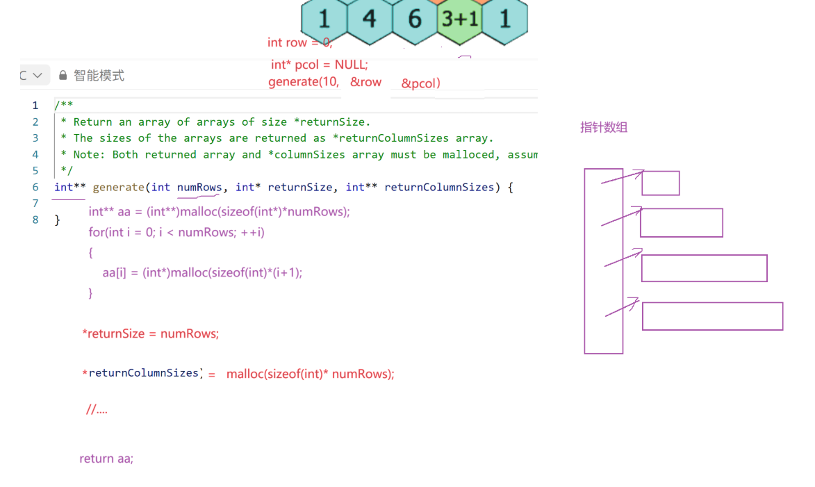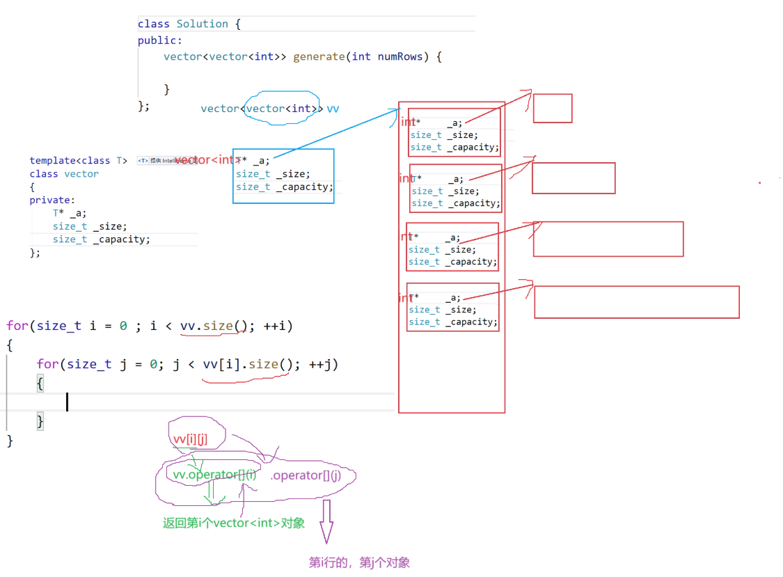 public:vector<vector<int>> generate(int numRows) {vector<vector<int>> vv;//定义行vv.resize(numRows,vector<int>());//定义列for(size_t i = 0;i < numRows;++i){vv[i].resize(i + 1,1);//1}for(size_t i = 2;i < vv.size();++i)//第0、1行的都不需要处理,1{for(size_t j = 1;j < vv[i].size() - 1;++j){vv[i][j] = vv[i-1][j] + vv[i-1][j-1];}}return vv;}