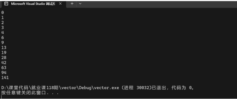 {vector<int> v1;const int n = 100;v1.reserve(n);size_t old = v1.capacity();size_t begin = clock();for (size_t i = 0; i < n; i++){v1.push_back(i);if (old != v1.capacity()){cout << v1.capacity() << endl;old = v1.capacity();}}