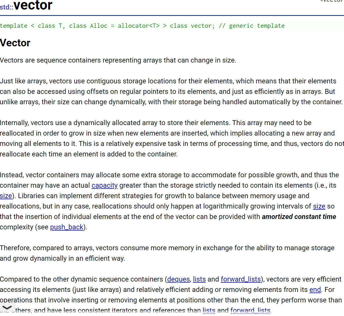 相反,向量容器可能会分配一些额外的存储空间以应对可能的增长,因此容器的实际容量可能会大于严格容纳其元素所需的存储空间(即其大小)。不同的库可以实现不同的增长策略,以平衡内存使用和重新分配的开销,但无论如何,重新分配应该只在大小呈对数增长的间隔发生,这样才能保证在向量末尾插入单个元素的时间复杂度为均摊常数时间(参见 push_back 操作)。