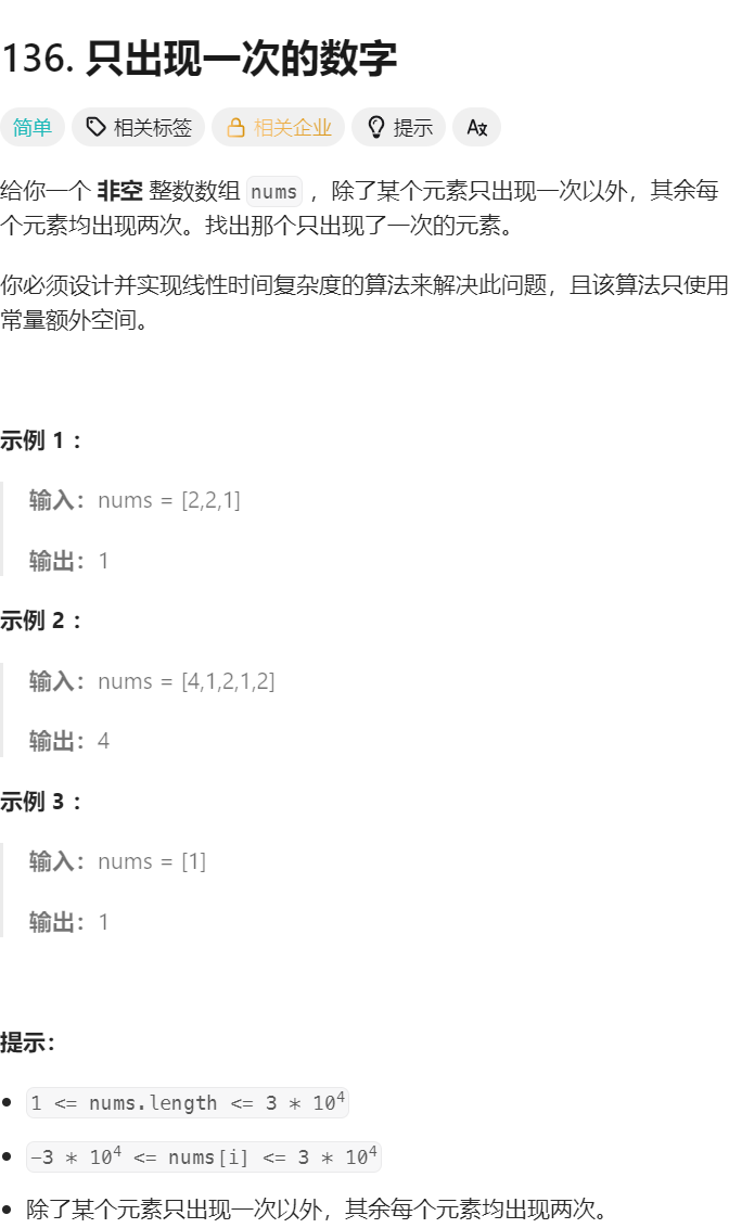 力扣链接:只出现一次的数字