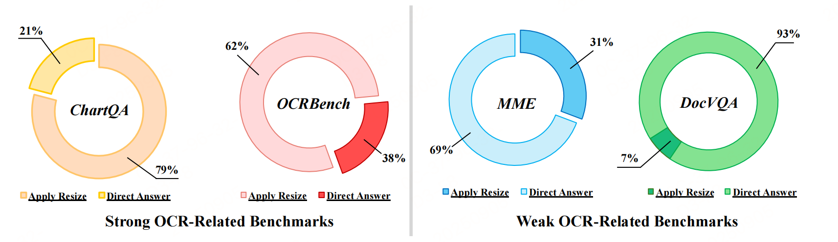 VisionThink 智能地确定高分辨率图像的比率。应用调整大小表示模型自主请求查看原始高分辨率图像,而直接回答则表示模型仅使用 1/4 大小的图像即可回答问题。