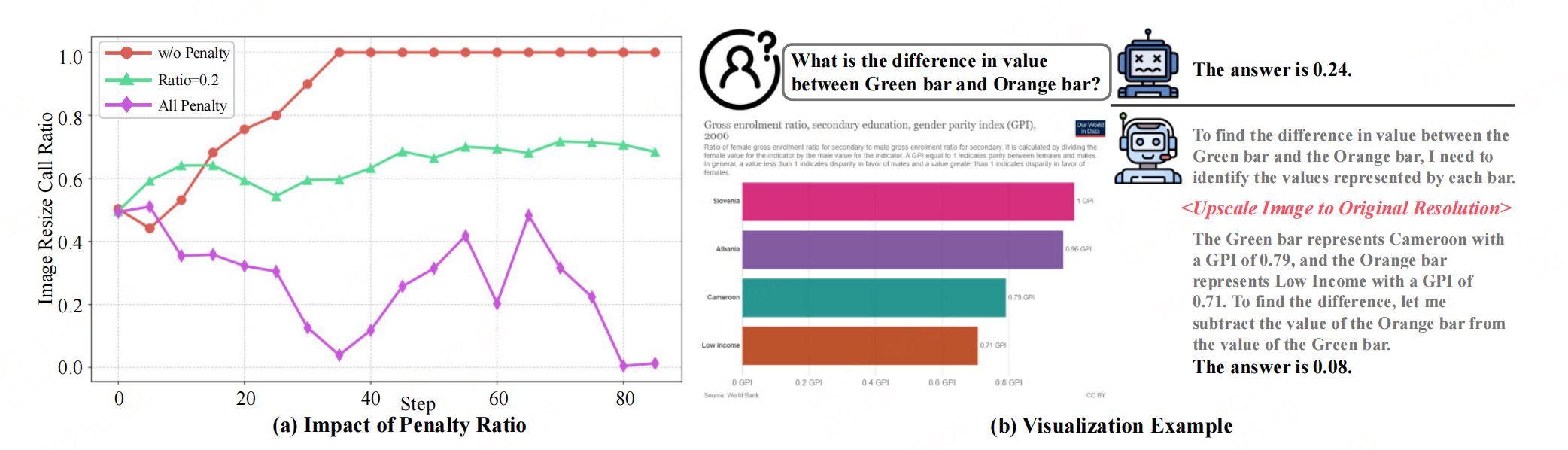 惩罚控制:由于使用高分辨率图像通常能提升性能,若没有任何惩罚,模型倾向于始终请求高分辨率图像。为防止这种情况,最初遵循 Search-R1对依赖高分辨率图像的正确回答施加了 0.1 的惩罚。然而,这种方法导致模型偏好直接回答,引发模型仅依赖直接回答的崩溃现象,如下图中的紫色线所示。原因在于,即使是模糊的低分辨率图像有时也能让模型猜出正确答案,而 0.1 的惩罚无意中强化了这种直接回答的偏好。引入一个阈值来控制这种现象。当使用低分辨率图像正确回答的概率较低时,对直接答案施加 0.1 的惩罚,以鼓励高分辨率请求;反之,当概率较高时,对高分辨率请求施加 0.1 的惩罚。