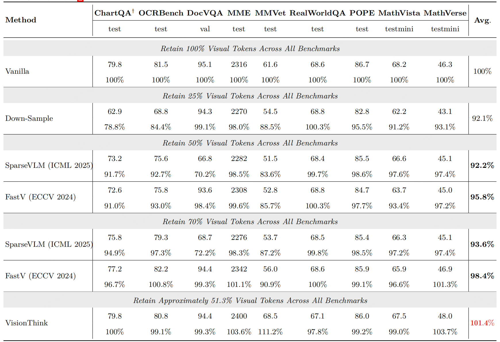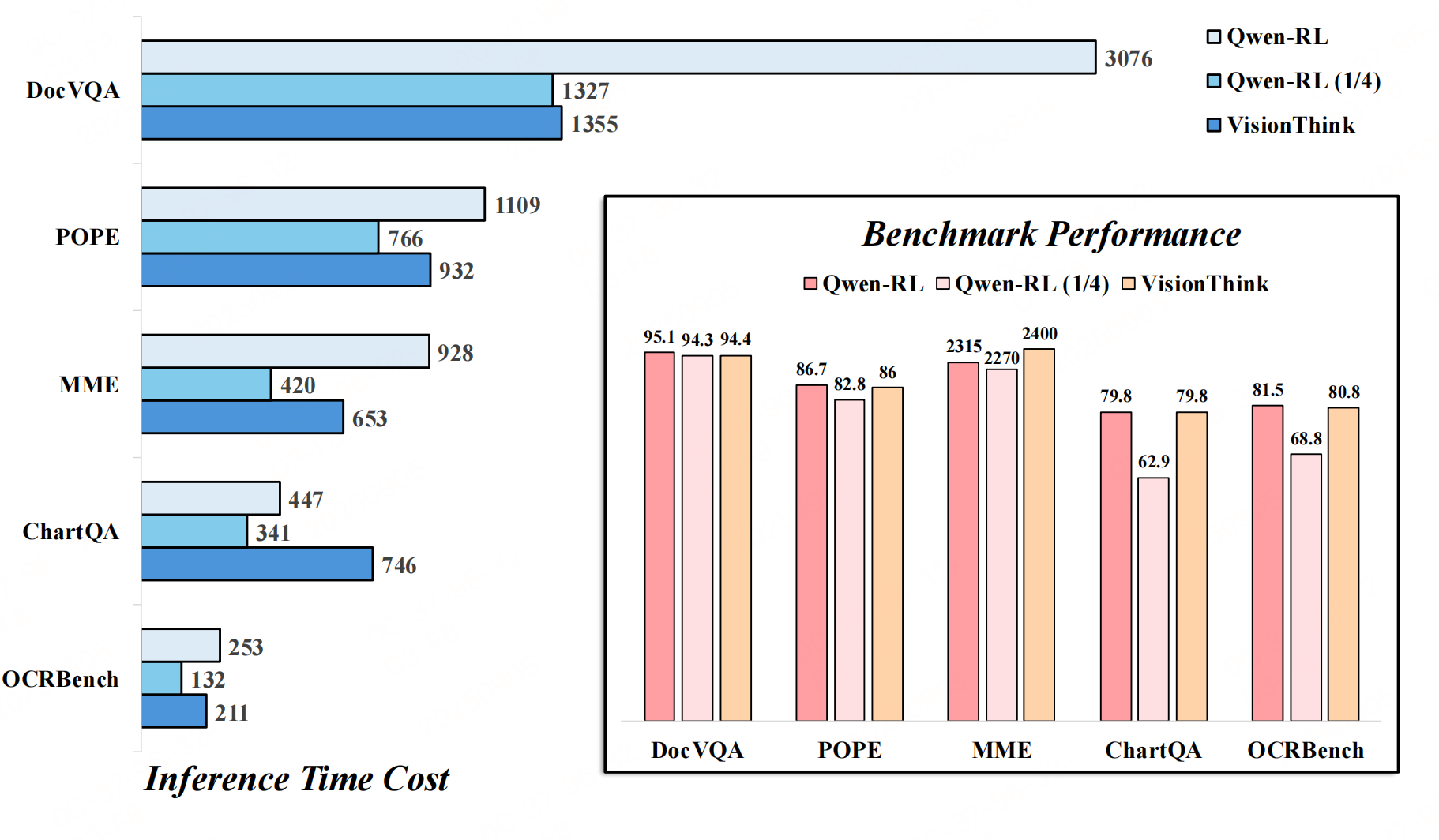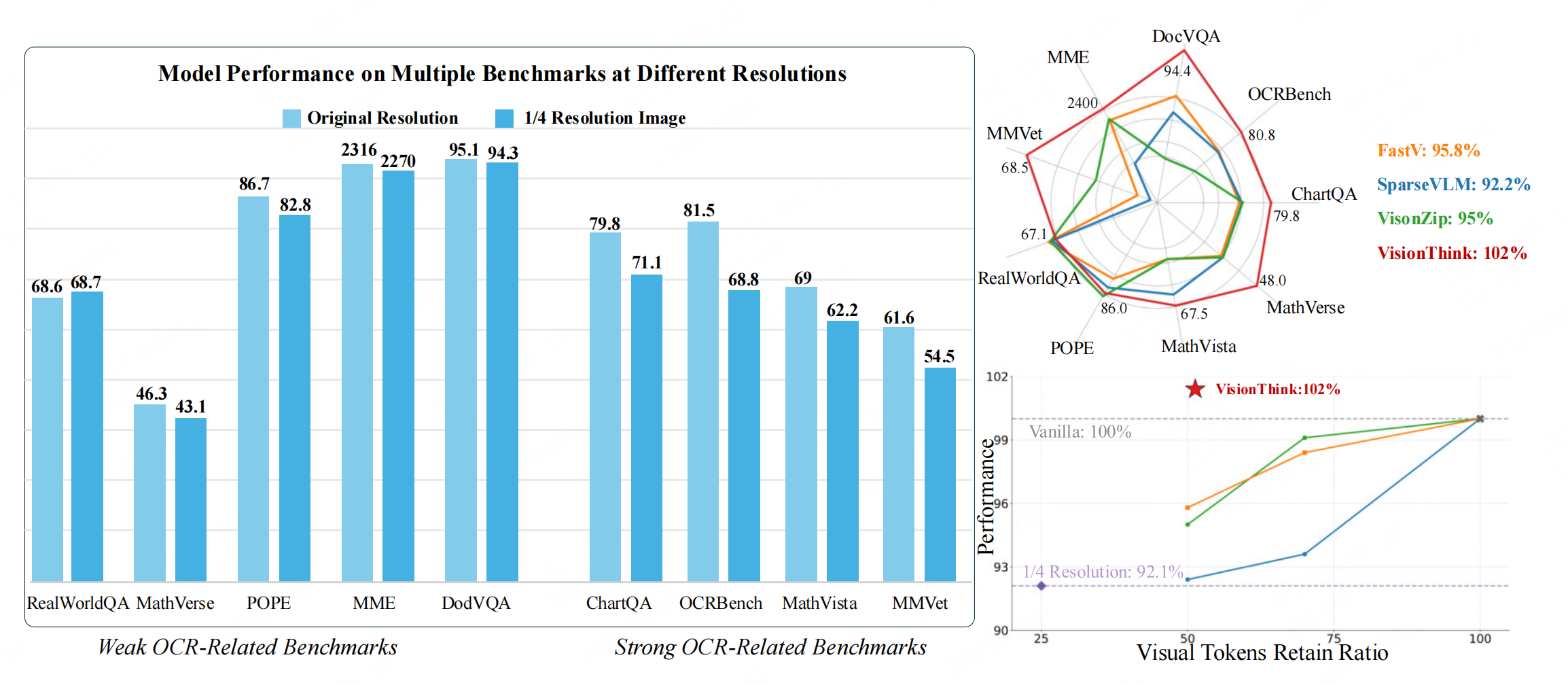 - 右图:VisionThink 在性能和效率上均显著优于之前的工作。