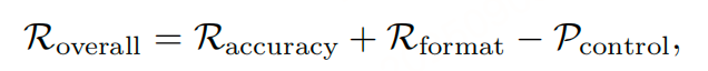 格式奖励:推理过程需包含在“< think>< /think>” 标签内,最终答案置于 “< answer>< /answer>” 标签中,且函数调用需符合规定的 JSON 格式。若其中任一格式有误,则格式化得分为 0。只有当所有格式均正确时,模型才能获得满分的格式化得分 0.5。