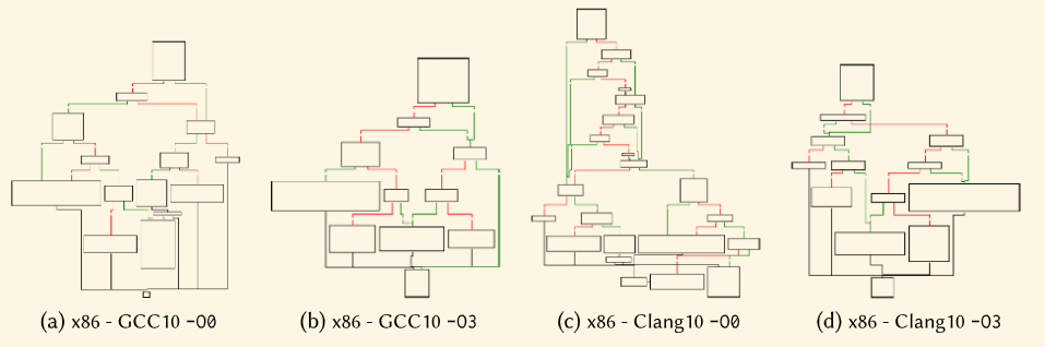 结构差异。程序的控制流图(CFG)决定了执行可以通过程序流动的可能路径。许多二进制差异比较工具依赖于CFG的结构特性来比较程序。这些工具首先为二进制文件中的每个函数构建一个控制流图,然后使用图同构算法或机器学习算法和模型来比较它们,识别相似或相同的子图。然而,这些算法依赖于结构特性,而这些特性可能会受到二进制代码生成方式的显著影响。特别是,像循环展开、函数内联和尾调用消除这样的优化会对程序的控制流图产生重大变化。