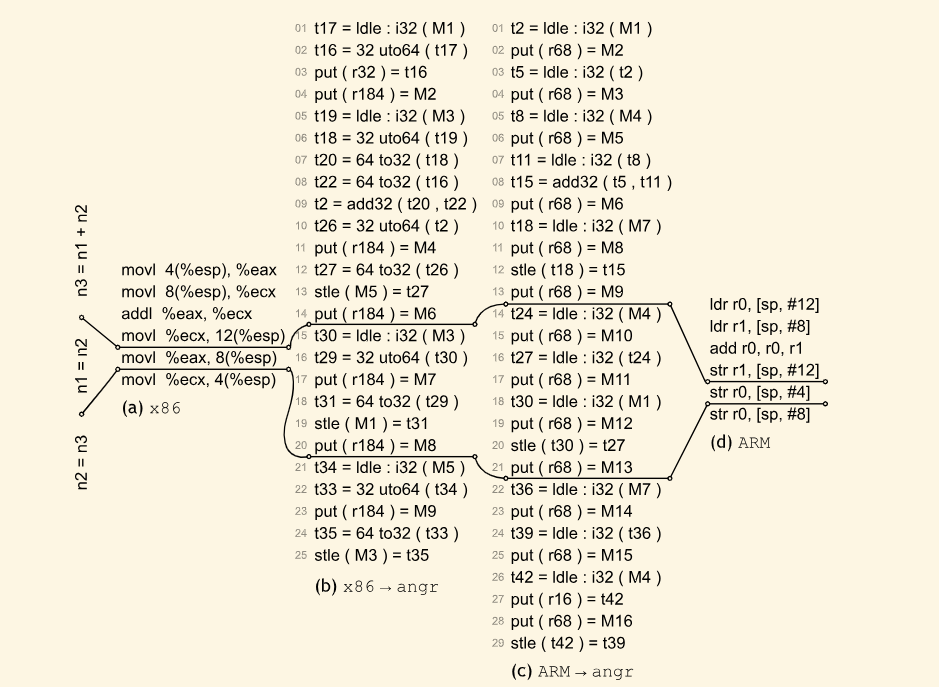 上图中(b)和(c)显示了两个VEX-IR程序。这两个程序实现了相同的三条操作序列。它们的不同之处在于它们是由不同的汇编代码生成的。图2(a)和(d)中的每一行代码表示一个指令,名称如t26代表变量。VEX-IR程序可以使用无限制的这些名称。事实上,静态单赋值特性确保每个变量都被新名称定义。相比之下,内存地址和寄存器不遵循这一特性。因此,如图2(a)中的寄存器r184可以被多次修改。同样,内存地址如M1或M2也是如此。