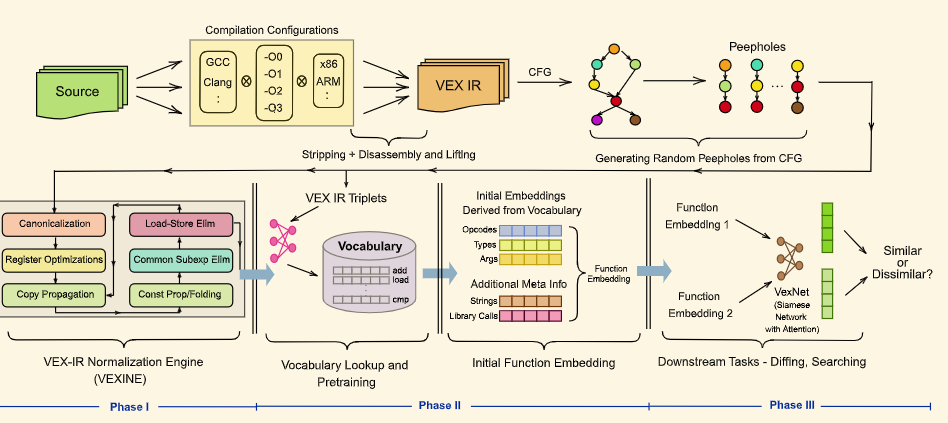 关键思想。VexIR2Vec设计的直觉是,通过将两个相似的函数分解为足够多的peephole,随后进行规范化处理,这些peephole中的许多可能会具有相似的语义,并且遮蔽最小化。虽然规范化减少了反汇编器引起的杂乱,但底层的训练过程负责处理识别功能相似性的关键任务,从而使模型能够处理更清洁的输入,进行更准确的分析。将这一直觉实现为一个实际工具能够在精度和可扩展性方面克服以往工作的局限性。