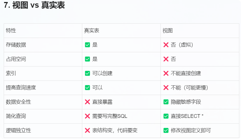 - 性能问题:视图不存储数据,每次查询都要重新执行