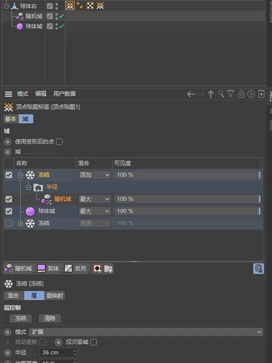 接下来是关键步骤:为右侧球体的顶点贴图设置动画。这里我们通过域的扩张生长动画来实现对布料模拟的精确控制。