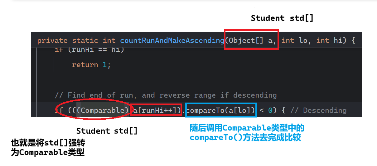 这是原本正确运行需要进行的,但是 我们现在连 Comparable 接口都还没有实现,怎么能强转为 Comparable 类型呢,更不用说调用 compareTo()方法了