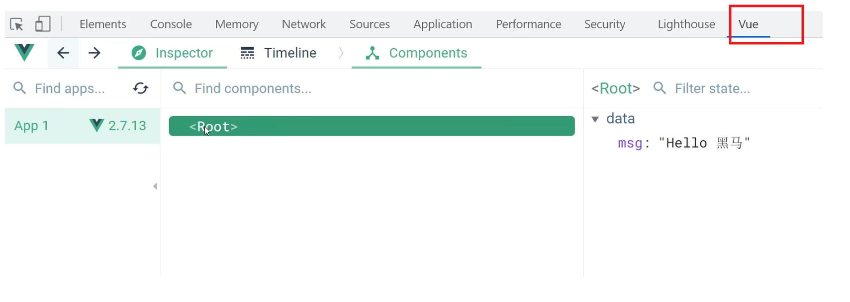 (3)打开 Vue 运行的页面,调试工具中 Vue 栏,即可查看修改数据,进行调试