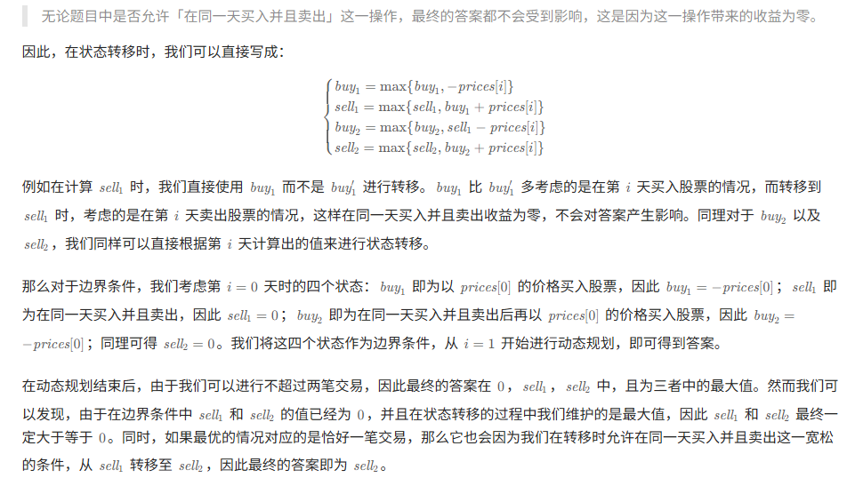 class Solution {public int maxProfit(int[] prices) {int n = prices.length;int buy1 = -prices[0], sell1 = 0; //开局负资产int buy2 = -prices[0], sell2 = 0; //买入负债for (int i = 1; i < n; ++i) {buy1 = Math.max(buy1, -prices[i]); //尝试买入第一支,buy代表当前持有的最低价sell1 = Math.max(sell1, buy1 + prices[i]); //尝试卖出第一支,看看比原来能不能卖更多buy2 = Math.max(buy2, sell1 - prices[i]); //尝试买入第二支sell2 = Math.max(sell2, buy2 + prices[i]); //尝试卖出第二支,得到的sell2即为总利润}return sell2;}