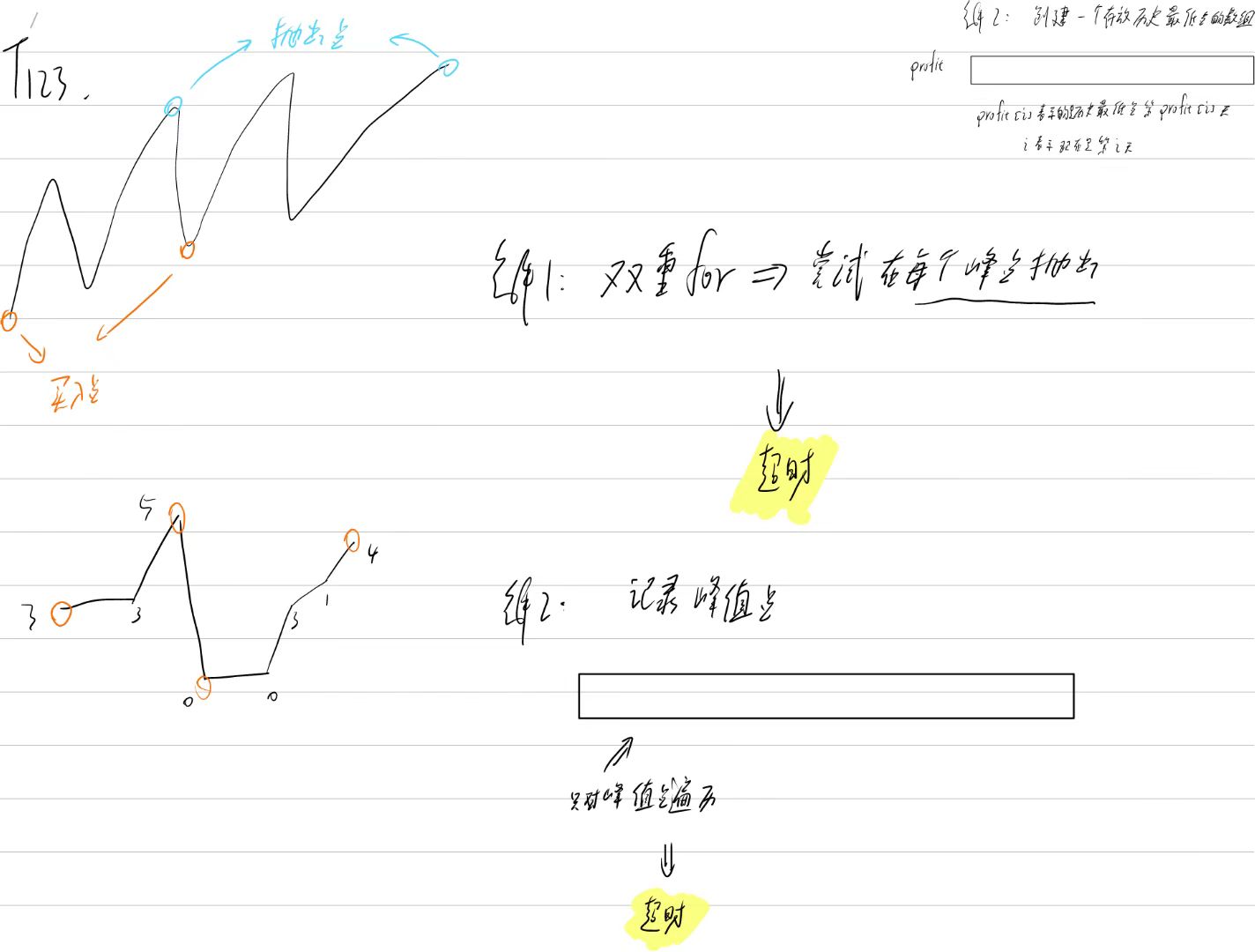 class Solution {public int maxProfit(int[] prices) {int max = 0; //结果List<Integer> point = new ArrayList(); //存放峰值点int profit1 = 0; //第一支股票的当前利润int profit2 = 0; //第二支股票的当前利润int min_price1 = 0; //第一支股票的历史低点int min_price2 = 0; //第二支股票的历史低点//记录峰值点point.add(prices[0]); //第一个点for(int i = 1; i < prices.length - 1; i++){if(prices[i - 1] >= prices[i] && prices[i + 1] >= prices[i]) //峰值低点point.add(prices[i]);if(prices[i - 1] <= prices[i] && prices[i + 1] <= prices[i]) //峰值高点point.add(prices[i]);}point.add(prices[prices.length - 1]); //最后一个点for(int i = 0; i < point.size(); i++){ //第一支股票【相当于问题II】if(point.get(i) < point.get(min_price1)) //更新最低点min_price1 = i;if(point.get(i) - point.get(min_price1) > profit1){ //当前利润相比上次上涨,记录当前利润profit1 = point.get(i) - point.get(min_price1);if(i == point.size() - 1 && profit1 > max) //一直涨到最后,抛max = profit1;}else{ //当前利润出现下降,抛出,计算基于第一支股票在当前抛出后,第二支股票的最大利润min_price2 = i;for(int j = i + 1; j < point.size(); j++) //第二支股票【相当于问题I】if(point.get(j) < point.get(min_price2)) //更新最低点min_price2 = j;else if(point.get(j) - point.get(min_price2) > profit2) //更新第二支股票的最大利润profit2 = point.get(j) - point.get(min_price2);if(profit1 + profit2 > max) //找到第二支股票的最大利润max = profit1 + profit2;profit1 = 0; //初始化第一支股票的当前利润profit2 = 0; //初始化第二支股票的当前利润 } }return max;}