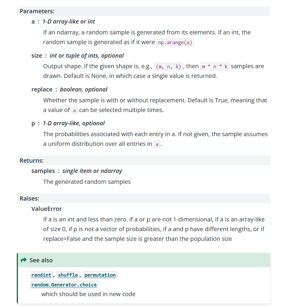 p | 每个元素被抽取的概率(权重)。长度必须与 a 相同,且和为 1。 | None (即平均概率) |