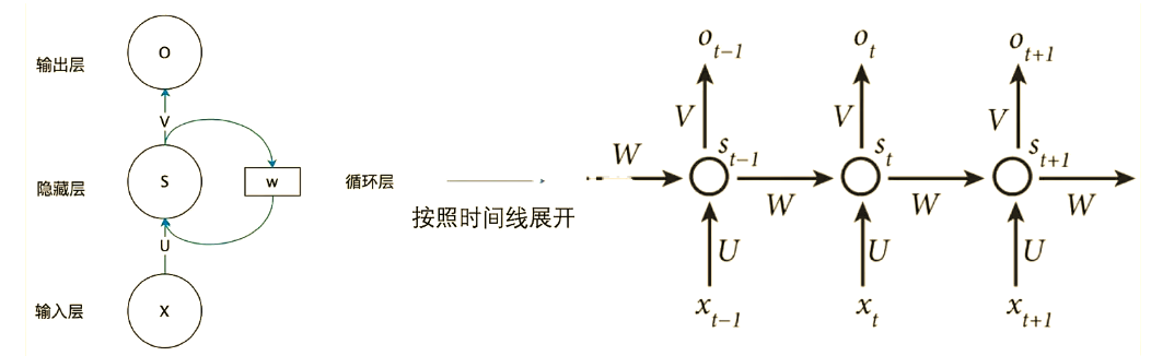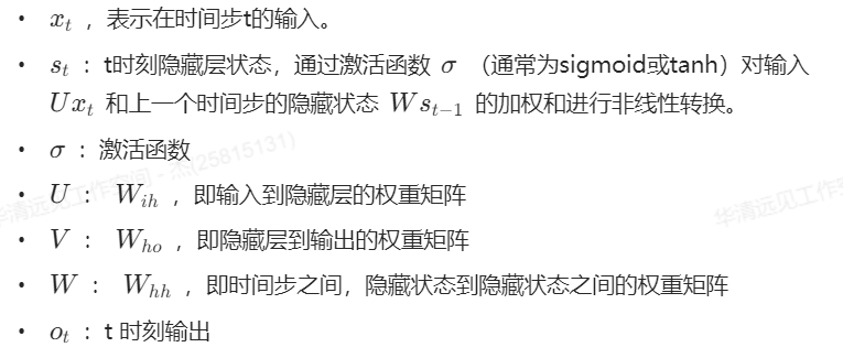总结:RNN 的循环结构通过每个时间步整合当前输入与前一时间步的隐藏状态,实现序列信息的有效捕捉,RNN中的由于W、U、V 是共享的,也就是说,对于不同时刻的输入,循环神经网络都执行相同的操作。这种共享机制不仅可以极大的减少网络需要学习的参数数量,而且使得网络可以处理长度不固定的输入序列。如上图左边图所示。