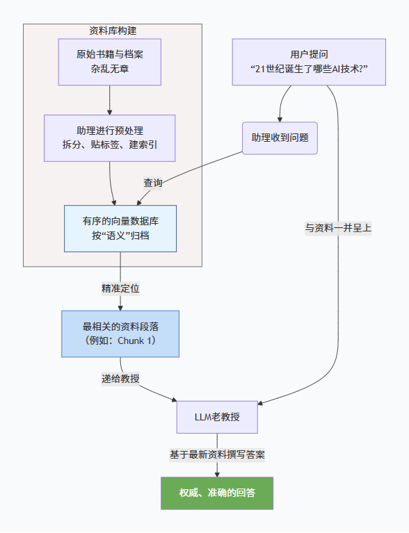 RAG (Retrieval-Augmented Generation,检索增强生成) 就是为了解决这些问题而诞生的。它相当于给这位“专家”配了一个强大的外部知识库助理和一套高效的检索工具。每当有问题来时,助理会先快速地去资料库(知识库)里查找最相关的资料,然后把资料和问题一起交给专家,专家再基于这些最新的、准确的资料来组织语言回答问题。