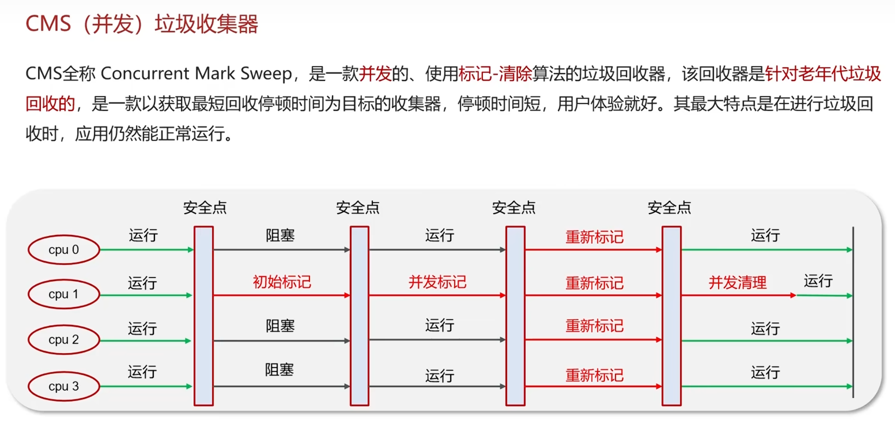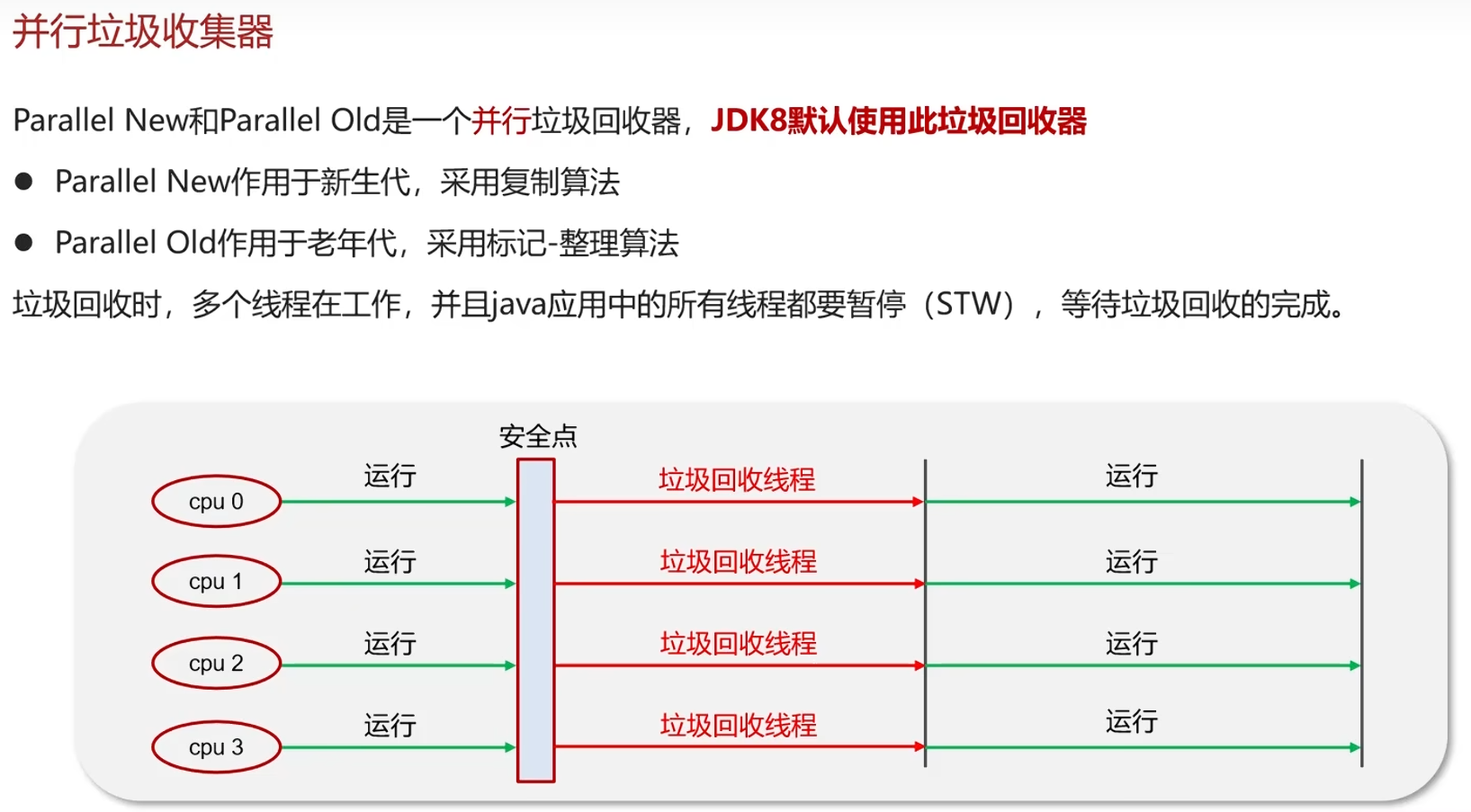在jvm中,实现了多种垃圾收集器,包括: ● 串行垃圾收集器: Serial GC、Serial Old GC ● 并行垃圾收集器: Parallel Old GC、ParNew GC ● CMS(并发)垃圾收集器: CMS GC, 作用在老年代 ● G1垃圾收集器, 作用在新生代和老年代