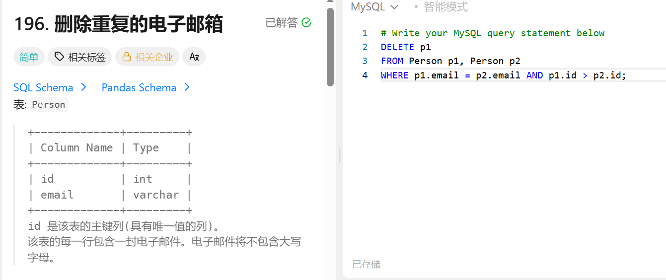 通过自连接(表与自身连接)识别重复记录,依据 “相同电子邮件且 ID 更大” 的条件定位需要删除的重复项,最终保留每个电子邮件对应的最小 ID 记录。