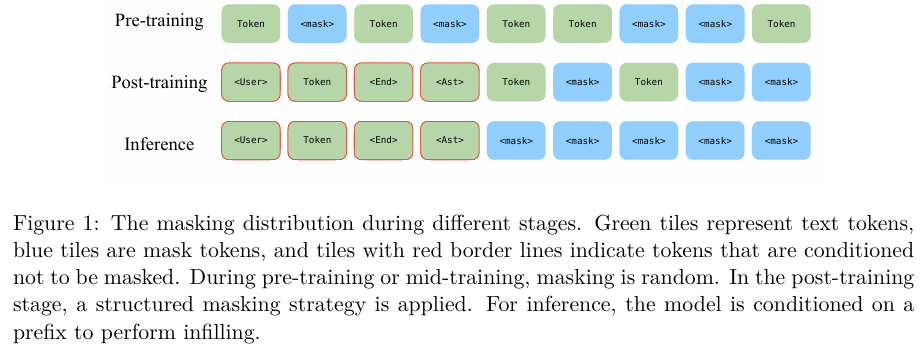 模型采用渐进式掩码策略,包括随机掩码、不可掩码前缀、截断后缀和块掩码,以增强模型对复杂掩码模式的处理能力。